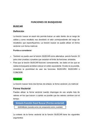 Este documento proporciona información sobre las funciones BUSCAR, BUSCARH y BUSCARV en Excel. Explica que BUSCAR busca un valor en un rango y devuelve un resultado de un rango especificado. BUSCARH busca un valor en la fila superior de una tabla y devuelve un valor de la misma columna de una fila indicada. BUSCARV busca un valor en la columna izquierda de una matriz y devuelve un valor de la misma fila de una columna especificada. Proporciona ejemplos y sintaxis detalladas para cada función.
