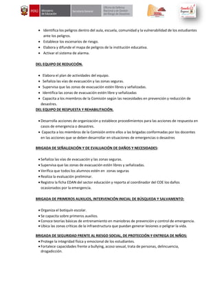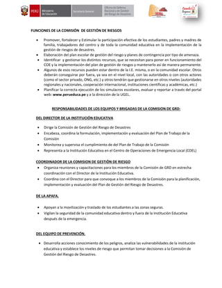 La comisión de gestión de riesgos tiene las siguientes funciones principales: 1) promover la participación de la comunidad educativa en la gestión de riesgos, 2) elaborar planes de gestión de riesgos y contingencia, y 3) identificar y gestionar los recursos necesarios para implementar dichos planes. Las responsabilidades de los equipos y brigadas incluyen tareas de prevención, reducción de riesgos, respuesta a emergencias, y rehabilitación posterior a desastres.
