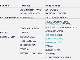 El documento presenta un resumen de las principales teorías administrativas como la teoría clásica, teoría de la burocracia y teoría de las relaciones humanas, enfocándose en la organización formal, las funciones del administrador y el análisis organizacional. También describe el ambiente externo que incluye factores políticos, económicos, sociales y ambientales que afectan a las organizaciones, así como la competencia directa e indirecta y los clientes.