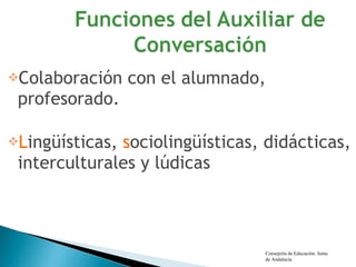 El documento describe las responsabilidades y funciones de los profesores bilingües en colaboración con los profesores y alumnos. Entre estas funciones se incluyen ayudar a planificar clases, buscar recursos, preparar materiales didácticos, fomentar la práctica oral de la lengua extranjera, proporcionar modelos de pronunciación y registros adecuados, y acercar a los alumnos a la cultura del país de la lengua extranjera a través de actividades complementarias.