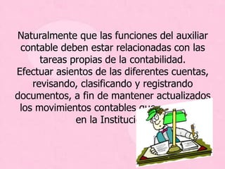 El documento describe que no existe una ley que defina las funciones de un auxiliar contable, por lo que estas se determinan por la realidad del mercado laboral y de cada empresa. Generalmente, las funciones de un auxiliar contable incluyen tareas como registrar documentos contables, revisar y clasificar documentación, y mantener la contabilidad actualizada.