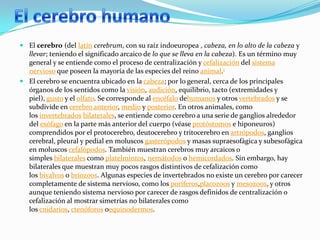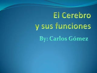 El documento resume las principales características del cerebro. Explica que el cerebro se encuentra en la cabeza y controla funciones como los sentidos, las emociones y el comportamiento. También describe las tres principales unidades funcionales del cerebro: la regulación muscular y de la vigilia, el procesamiento y almacenamiento de información, y la programación y regulación de la actividad mental. Además, resalta que la memoria es una de las funciones cognitivas más importantes del cerebro.