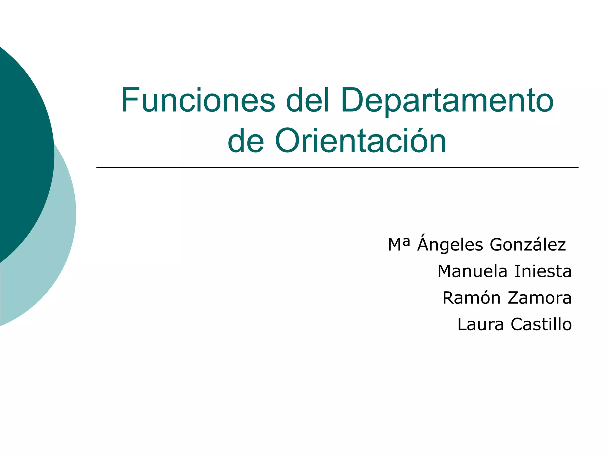 El documento describe las funciones del Departamento de Orientación de un centro educativo. Entre sus funciones se encuentran asesorar y orientar al alumnado, profesorado, equipos directivos y familias; coordinarse con otros departamentos y servicios externos; realizar diagnósticos, intervenciones y planes de prevención; y contribuir a la formación de los agentes educativos.