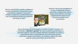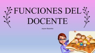 El documento describe las funciones principales del docente, incluyendo preparar clases con estrategias didácticas centradas en el estudiante, motivar a los estudiantes, guiar su aprendizaje, evaluarlos, y continuar desarrollándose profesionalmente a través de la investigación y la formación continua.