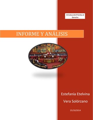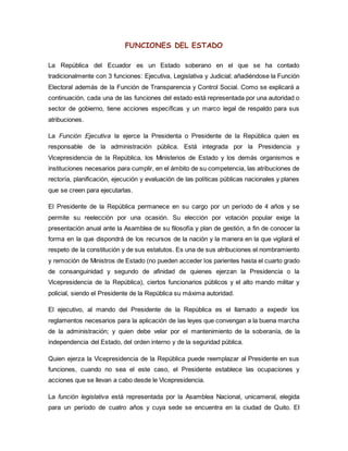 El documento describe las funciones del Estado en Ecuador, incluyendo las funciones ejecutiva, legislativa, judicial, electoral y de transparencia y control social. La función ejecutiva la ejerce el Presidente, la legislativa la Asamblea Nacional, y la judicial los órganos judiciales. La función electoral garantiza los derechos políticos a través del Consejo Nacional Electoral y el Tribunal Contencioso Electoral. La función de transparencia y control social promueve la participación ciudadana a través del Consejo de Participación Ciudadana y Control Social y la Contraloría General