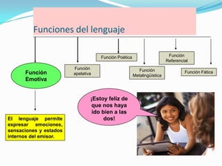 El documento presenta las diferentes funciones del lenguaje: la función referencial, la función emotiva, la función conativa, la función fática, la función poética y la función metalingüística. Cada función se refiere a un factor diferente en el proceso comunicativo y se manifiesta de manera distinta a través del lenguaje.