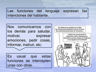 Este documento describe las principales funciones del lenguaje, incluyendo la función denotativa para proporcionar información objetiva, la función emotiva para expresar sentimientos, la función conativa para obtener una respuesta del receptor, la función fática para iniciar o mantener una conversación, la función poética en escritos literarios, y la función metalingüística para hablar sobre el lenguaje mismo. Explica que estas funciones a menudo se entrelazan y proporciona ejemplos de cada una.