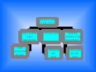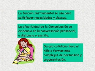 El documento describe las diferentes funciones del lenguaje instrumental, regulativa, interactiva, personal, imaginativa, heurística e informativa. También discute los componentes del lenguaje semántico, sintáctico, fonográfico y pragmático, así como diferentes tipos de textos y formas de expresión oral como monólogos, entrevistas y debates. Finalmente, aborda la evaluación de la lectura y la construcción del significado.