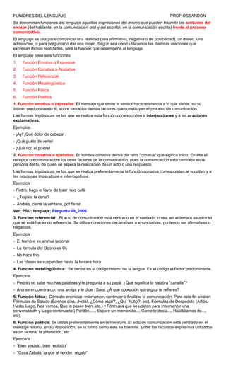 Este documento describe las seis funciones principales del lenguaje: emotiva, conativa, referencial, metalingüística, fática y poética. Explica que las funciones del lenguaje transmiten las actitudes del emisor y que el lenguaje se usa para comunicar realidades, deseos, admiración, preguntas u órdenes. Luego define cada función y proporciona ejemplos para ilustrarlas.