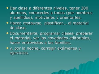 El documento describe las múltiples responsabilidades y tareas de un maestro, incluyendo detectar problemas de salud en los estudiantes, actuar como figura paterna para aquellos con carencias afectivas, coordinar reuniones, planificar clases, corregir exámenes, enseñar diferentes asignaturas y niveles, y brindar apoyo psicológico y emocional a los padres. Además, los maestros a menudo deben realizar tareas administrativas y de mantenimiento sin recibir el reconocimiento o agra