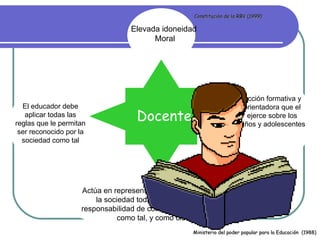 El documento aborda la formación y conducta profesional del docente en el contexto educativo contemporáneo, destacando la importancia de la ética y la responsabilidad social en la enseñanza. Se enfatiza el perfil del docente de química, que debe combinar conocimientos teóricos y prácticos con un compromiso hacia el desarrollo sostenible y el entendimiento de la realidad social. Además, se destacan deberes como la puntualidad, el trato equitativo a los estudiantes y la promoción de la conservación ambiental.