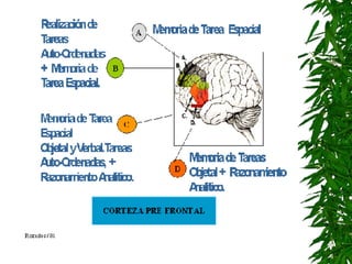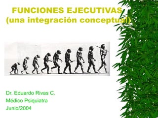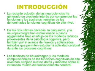 El documento resume las funciones ejecutivas como los procesos cognitivos de alto nivel relacionados con la planificación, la toma de decisiones, la resolución de problemas y el control inhibitorio. Estas funciones se asocian principalmente con la corteza prefrontal. Las disfunciones ejecutivas se caracterizan por la falta de autocontrol, la impulsividad y la dificultad para completar tareas complejas. El documento también revisa brevemente la historia del estudio de las funciones ejecutivas y algunas patologías asociadas.