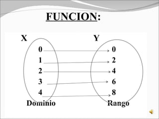 La función asigna a cada valor de X un único valor de Y, mientras que la relación puede asignar varios valores de Y a cada valor de X. Se define una función y una relación numérica como ejemplos, y se piden ejercicios para representar gráficamente la función y relación usando ejes cartesianos y puntos ordenados.