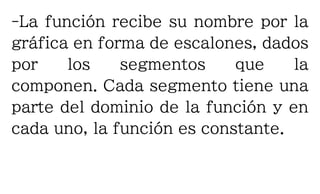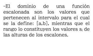 La función escalonada se caracteriza por segmentos constantes en su dominio, el cual es un intervalo cerrado, y su rango consiste en los valores de las alturas de los escalones. Es continua salvo en los puntos de cambio, donde su derivada es cero; sin embargo, la derivada no existe en las discontinuidades. La integral de la función corresponde a la suma de las áreas de los rectángulos formados por los escalones.
