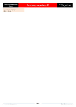 Este documento presenta 13 problemas de admisión relacionados con álgebra y funciones especiales. Los problemas incluyen determinar valores, gráficas y dominios de funciones, así como identificar propiedades como inyectividad, univalencia y biyectividad.