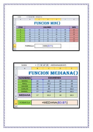 Este documento presenta varias funciones de Excel como CONTAR, CONTAR.SI, MAX, MODA y BUSCAR. Muestra ejemplos de su uso para contar actividades, encontrar el máximo valor en una columna o tabla, determinar el producto más vendido mediante MODA y buscar valores específicos en una tabla. El objetivo es enseñar a los estudiantes cómo aplicar estas funciones para analizar y resumir datos.
