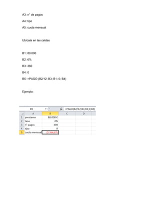 Este documento explica cómo usar las funciones financieras PAGO, PAGOINT y PAGOPRIN en Excel para calcular pagos mensuales, intereses pagados e importes amortizados de préstamos. Proporciona ejemplos de su uso para calcular cuotas de préstamos, ahorros mensuales requeridos y amortización de capital para diferentes escenarios de préstamos y ahorros.