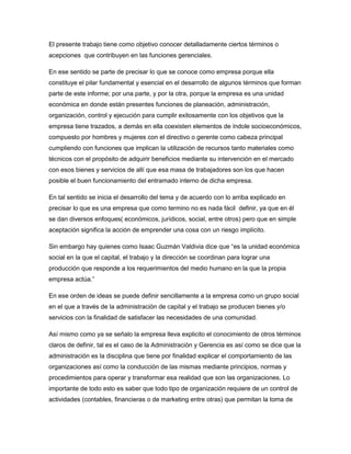 Este documento define y explica varios términos clave relacionados con la gerencia y la administración de empresas. Define una empresa como una unidad económica y social donde el capital, trabajo y dirección se coordinan para producir bienes y servicios. Explica que la administración implica la conducción de organizaciones a través de principios, normas y procedimientos, y que tiene características como ser universal, tener valor instrumental y ser interdisciplinaria. Finalmente, define la gerencia como el cargo que dirige una empresa u organización, coordinando los recursos a través de la