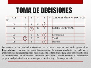 El documento describe los resultados de una evaluación de estilos gerenciales. El estilo gerencial del autor es especulativo, ya que le gusta desempeñarse de manera excelente y mantener la certeza de que las situaciones cambiarán para bien. Otras secciones analizan los resultados relacionados a la toma de decisiones, comunicación, conflicto, motivación, planificación y trabajo en equipo.