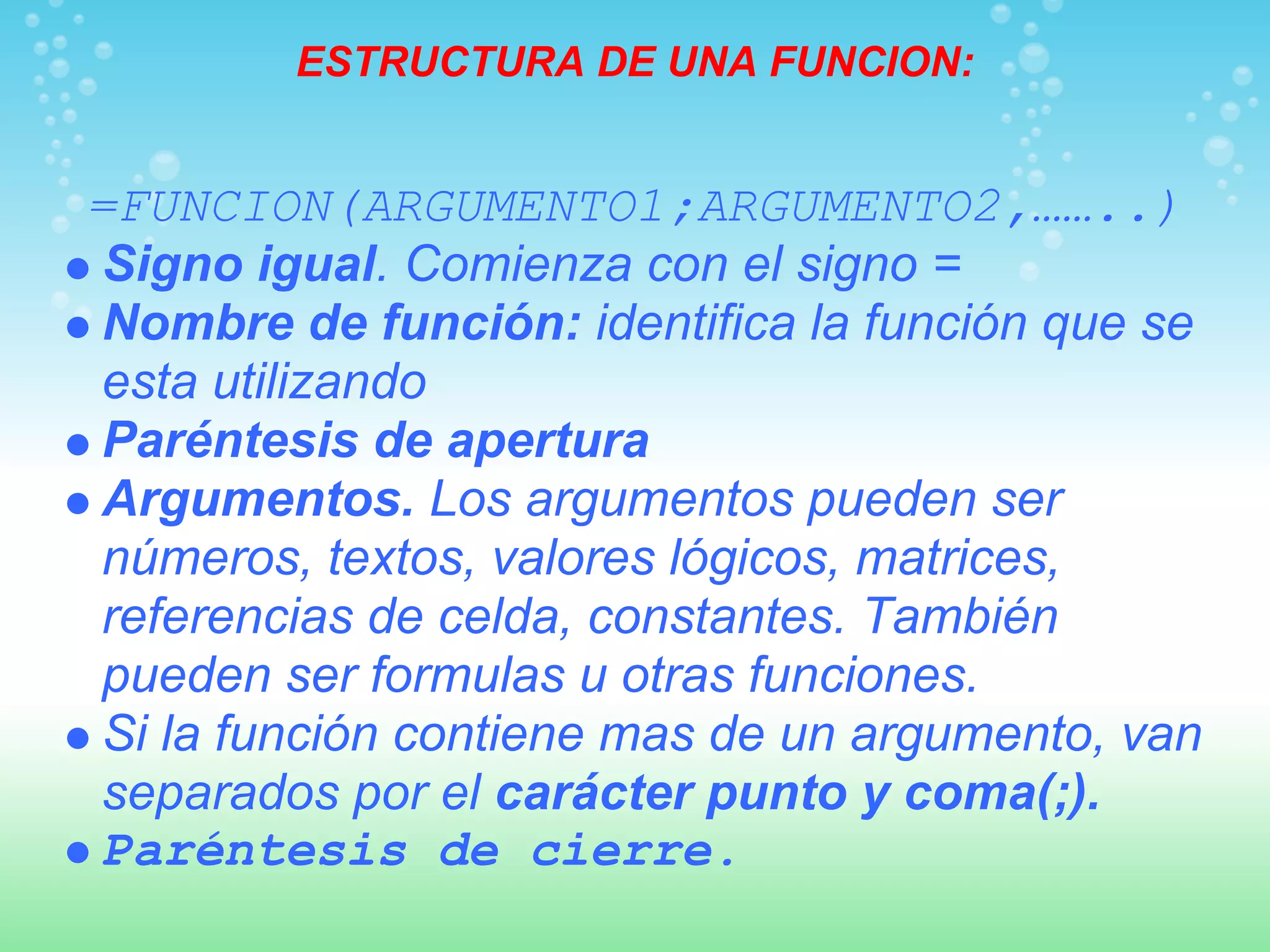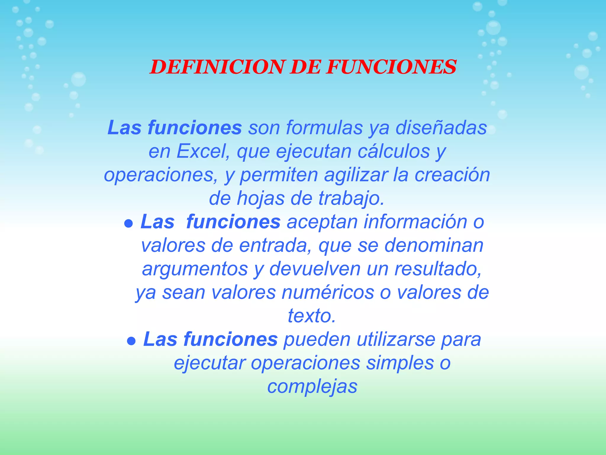 Las funciones son fórmulas predefinidas en Excel que realizan cálculos y operaciones para agilizar la creación de hojas de trabajo. Las funciones aceptan argumentos de entrada y devuelven un resultado. La estructura básica de una función en Excel es =NOMBRE(argumento1, argumento2, etc.).