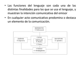 El documento describe las diferentes funciones del lenguaje, incluyendo la función referencial que se centra en transmitir información sobre la realidad, la emocional que se centra en los sentimientos del emisor, la conativa que se centra en provocar una reacción en el receptor, la fática que se centra en iniciar, comprobar y cerrar la comunicación, y la metalingüística que se centra en referirse a elementos de la lengua.