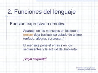 El documento describe las seis funciones principales del lenguaje: la función representativa o referencial, la función expresiva o emotiva, la función apelativa o conativa, la función fática o de contacto, la función metalingüística, y la función poética o estética. Cada función se caracteriza por el propósito del mensaje y el tipo de información que transmite.