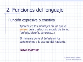 El documento presenta las diferentes funciones del lenguaje: referencial, expresiva, apelativa, fática, metalingüística y poética, cada una con su finalidad y características específicas. Se destacan ejemplos de cada función para ilustrar cómo se manifiestan en la comunicación. Estas funciones son fundamentales para comprender el uso del lenguaje en diversas contextos.