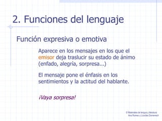 El documento describe las seis funciones principales del lenguaje: la función representativa o referencial, la función expresiva o emotiva, la función apelativa o conativa, la función fática o de contacto, la función metalingüística y la función poética o estética. Cada función se ilustra con un breve ejemplo.