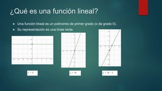 Una función lineal es un polinomio de primer grado cuya representación es una línea recta. Puede ser de tres tipos: constante, de proporcionalidad directa o afín. Se representa como y=mx+n, donde m es la pendiente y n la ordenada en el origen. Su dominio es R y su imagen depende de si m es distinto o igual a cero. Son continuas, pueden ser crecientes, decrecientes o constantes, y no son cóncavas, convexas ni periódicas.