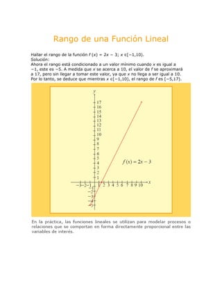 Una función lineal se representa gráficamente como una recta cuya pendiente está dada por el coeficiente a y cuyo punto de intersección con el eje y es b. Para graficarla, basta con obtener los puntos donde la recta intercepta los ejes x e y. El rango de una función lineal f(x)=2x-3 definida para x en [-1,10) es [-5,17).
