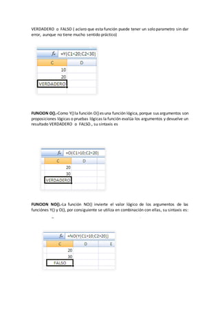 Una fórmula en Excel calcula un nuevo valor a partir de valores existentes usando operadores. Las fórmulas comienzan con el signo igual (=) y pueden incluir constantes, referencias de celdas, funciones y operadores para realizar cálculos de acuerdo con el orden especificado. Las funciones lógicas como SI, Y, O y NO evalúan proposiciones y devuelven resultados verdaderos o falsos.