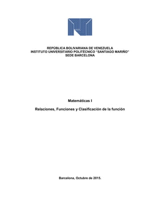 El documento resume las relaciones y funciones matemáticas, incluyendo que una relación es una correspondencia entre dos conjuntos mientras que una función requiere que cada elemento del primer conjunto corresponda a exactamente un elemento del segundo conjunto. También clasifica las funciones como inyectivas si cada elemento del dominio tiene una única imagen, sobreyectivas si cada elemento del rango es la imagen de al menos un elemento del dominio, y biyectivas si son tanto inyectivas como sobreyectivas.