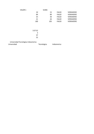El documento contiene una tabla con valores numéricos y las palabras "FALSO" y "VERDADERO" en columnas alternas, así como la hora, fecha y detalles de una universidad al final.