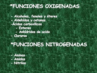El documento detalla la química de las funciones oxigenadas, incluyendo alcoholes, aldehídos, cetonas, y ácidos carboxílicos, así como sus propiedades, nomenclatura y reacciones. Se explican las características de cada grupo funcional, las reglas para nombrarlos y sus reacciones químicas importantes, como la oxidación y la formación de ésteres. Además, se aborda la síntesis y las reacciones de anhídridos y ésteres, así como la hidrólisis y transesterificación.