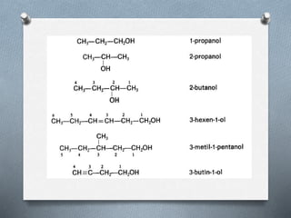 El documento trata sobre los alcoholes y éteres. Explica que los alcoholes son compuestos orgánicos que contienen el grupo funcional hidroxilo (-OH). Se utilizan como productos químicos intermedios y disolventes. Se clasifican en alcoholes polihidroxilados y se explica su nomenclatura. También se describen reacciones para su obtención y ejemplos. Los éteres resultan de la unión de dos radicales a través de un puente de oxígeno y su nomenclatura.