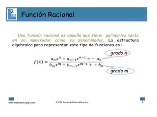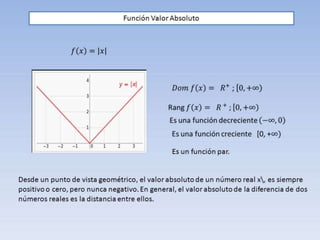 El documento explica las características fundamentales de las funciones, incluyendo que un dominio es el conjunto de valores de entrada y un rango es el conjunto de valores de salida. También describe los dominios y rangos específicos de varios tipos de funciones como funciones trigonométricas, funciones exponenciales y funciones logarítmicas.