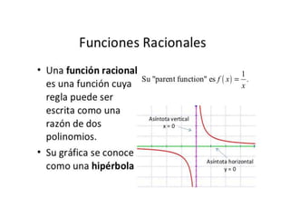 El documento explica las características fundamentales de las funciones, incluyendo que un dominio es el conjunto de valores de entrada y un rango es el conjunto de valores de salida. También describe los dominios y rangos específicos de varios tipos de funciones como funciones trigonométricas, funciones exponenciales y funciones logarítmicas.