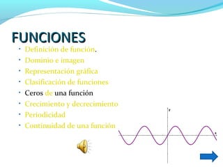 Este documento presenta un resumen de las funciones matemáticas. Define qué es una función y explica los conceptos de dominio e imagen. Luego clasifica diferentes tipos de funciones como lineales, cuadráticas, de proporcionalidad directa e inversa, y exponenciales. Finalmente, cubre temas como la representación gráfica, ceros, crecimiento y decrecimiento, periodicidad y continuidad de funciones.