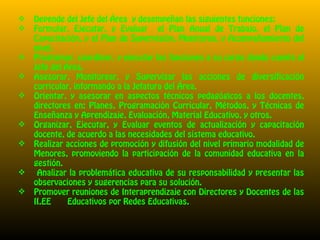 El documento describe las funciones de un supervisor de educación primaria. Estas incluyen formular, ejecutar y evaluar planes anuales de trabajo, capacitación y supervisión; programar, coordinar y ejecutar sus funciones; y asesorar, monitorear y supervisar la diversificación curricular. También se espera que oriente y asesore a docentes y directores, organice eventos de capacitación, promueva la participación comunitaria, y asuma otras funciones asignadas por su jefe.