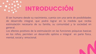 Este documento presenta varias actividades para estimular las funciones psíquicas básicas como la atención, percepción, memoria, lenguaje y pensamiento en niños de 5 a 6 años. Incluye juegos, ejercicios y tareas sensoriales enfocadas en desarrollar habilidades como la discriminación, coordinación, autoconcepto y capacidades cognitivas a través de los sentidos de la vista, el tacto, el oído y el olfato.