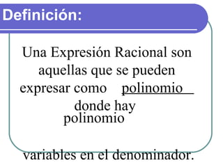 Este documento define funciones racionales y explica cómo graficarlas y resolver ecuaciones racionales. Las funciones racionales son expresiones donde el polinomio está en el numerador y el denominador. Para graficarlas, se identifican las asíntotas verticales y horizontales. Para resolver ecuaciones racionales, se factoriza, se halla el denominador común, y se multiplica la ecuación por este para obtener una expresión no racional que puede resolverse. También explica operaciones básicas como suma, resta, multiplicación y división de expresiones rac