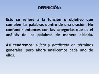 Este documento define las funciones sintácticas y describe los componentes básicos de una oración: sujeto, predicado, y complementos. Explica que el sujeto se refiere a quién o qué realiza la acción del verbo, y que el predicado dice algo sobre el sujeto e incluye el verbo principal. También describe los tipos de complementos y cómo aportan información adicional sobre el objeto, destinatario u otras circunstancias.
