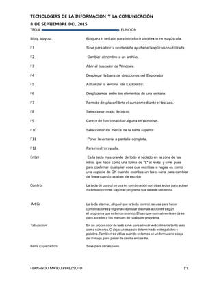 Este documento describe las funciones de varias teclas de función comunes en un teclado de computadora. Las teclas F1 a F12 tienen funciones específicas en diferentes aplicaciones como abrir ayuda, actualizar ventanas, cambiar entre elementos o poner una ventana a pantalla completa. Otras teclas como Enter, Control, AltGr, Tabulación y Barra Espaciadora también cumplen funciones útiles como confirmar selecciones, activar combinaciones de teclas o añadir espacios entre palabras.