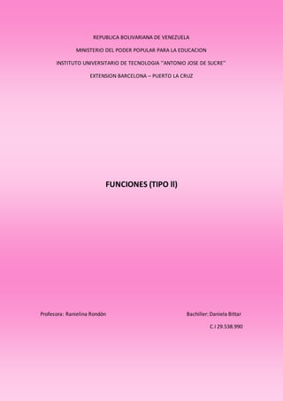 El documento describe diversas funciones matemáticas, incluyendo funciones racionales, trigonométricas, de valor absoluto, exponenciales y logarítmicas, y explica sus características, identificación y formas de graficarlas. Se enfatiza el comportamiento en el infinito, la continuidad y las asíntotas. También se discuten propiedades específicas de cada tipo de función, como dominio, codominio y periodicidad.