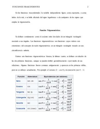 El documento describe diferentes tipos de funciones trascendentales como funciones trigonométricas, funciones inversas, funciones exponenciales y funciones logarítmicas. Define cada función, sus propiedades y representaciones gráficas. Explica que las funciones trigonométricas se definen a partir de relaciones en triángulos rectángulos y que existen seis funciones básicas. También describe cómo se define una función inversa y sus propiedades características.