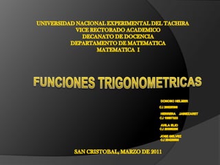 UNIVERSIDAD NACIONAL EXPERIMENTALDEL TACHIRAVICE RECTORADO ACADEMICODECANATO DE DOCENCIADEPARTAMENTO DE MATEMATICAMATEMATICA IDONOSO HELMER C.I 20625396 HERRERA JAINEZARETC.I 19597323 AVILA ELIO C.I 20308205 JOSE GELVEZ C.I 20426596 SAN CRISTOBAL, MARZO DE 2011FUNCIONES TRIGONOMETRICAS