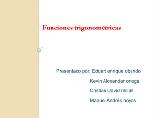 Este documento presenta las funciones trigonométricas básicas como seno, coseno y tangente, definiéndolas a través de las razones trigonométricas en un triángulo rectángulo. También introduce otras funciones como cosecante, secante y cotangente, y muestra gráficas de seno, coseno y tangente.