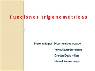 Las funciones trigonométricas se definen a partir de las razones trigonométricas en un triángulo rectángulo. Las más importantes son seno, coseno y tangente. Se muestran las gráficas periódicas de sen(x), cos(x) y tan(x), así como definiciones de cosecante, secante y cotangente.