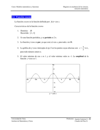 El documento describe las funciones trigonométricas, su uso en ciencias naturales y las características específicas de las funciones seno, coseno y tangente. Además, se abordan las transformaciones de las gráficas de estas funciones y ejemplos de su aplicación, incluyendo el movimiento armónico simple. Se destaca la importancia histórica de figuras como Euler en el tratamiento sistemático de las funciones trigonométricas.