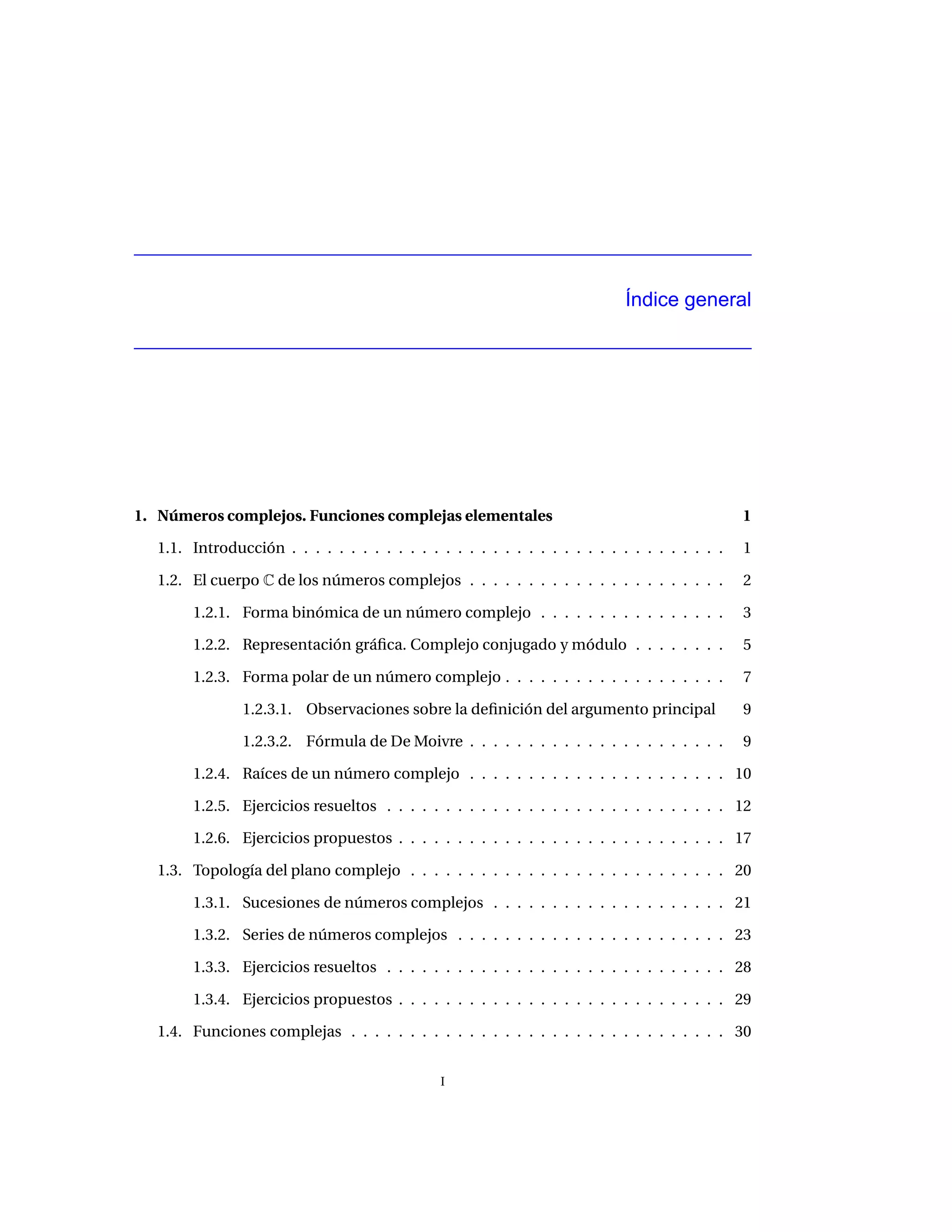 Este documento es un curso sobre análisis complejo que incluye seis capítulos. Introduce los números complejos y funciones elementales, la teoría de Cauchy elemental, propiedades locales de funciones holomorfas, la forma general del teorema de Cauchy y singularidades aisladas de funciones holomorfas. El documento proporciona definiciones, teoremas, ejemplos resueltos y ejercicios para cada tema.